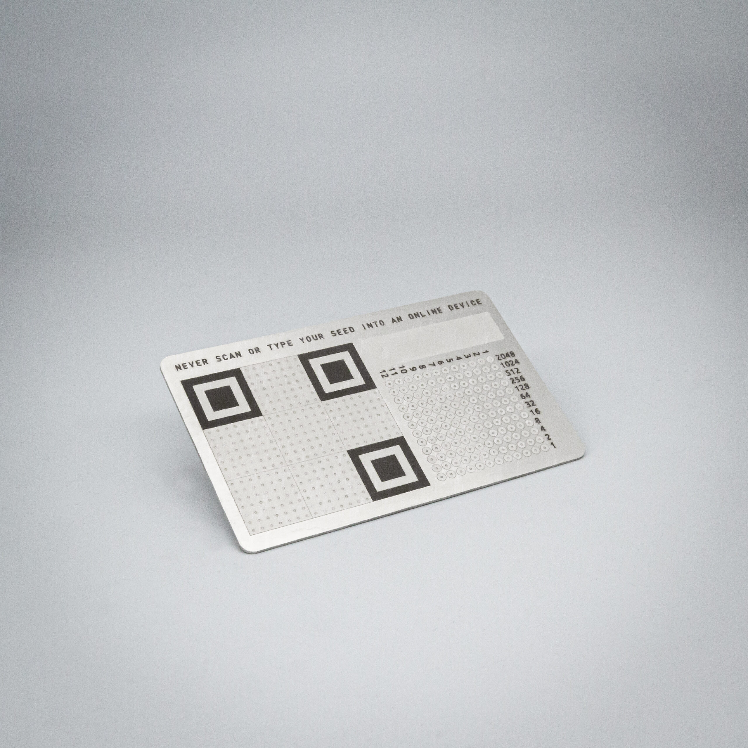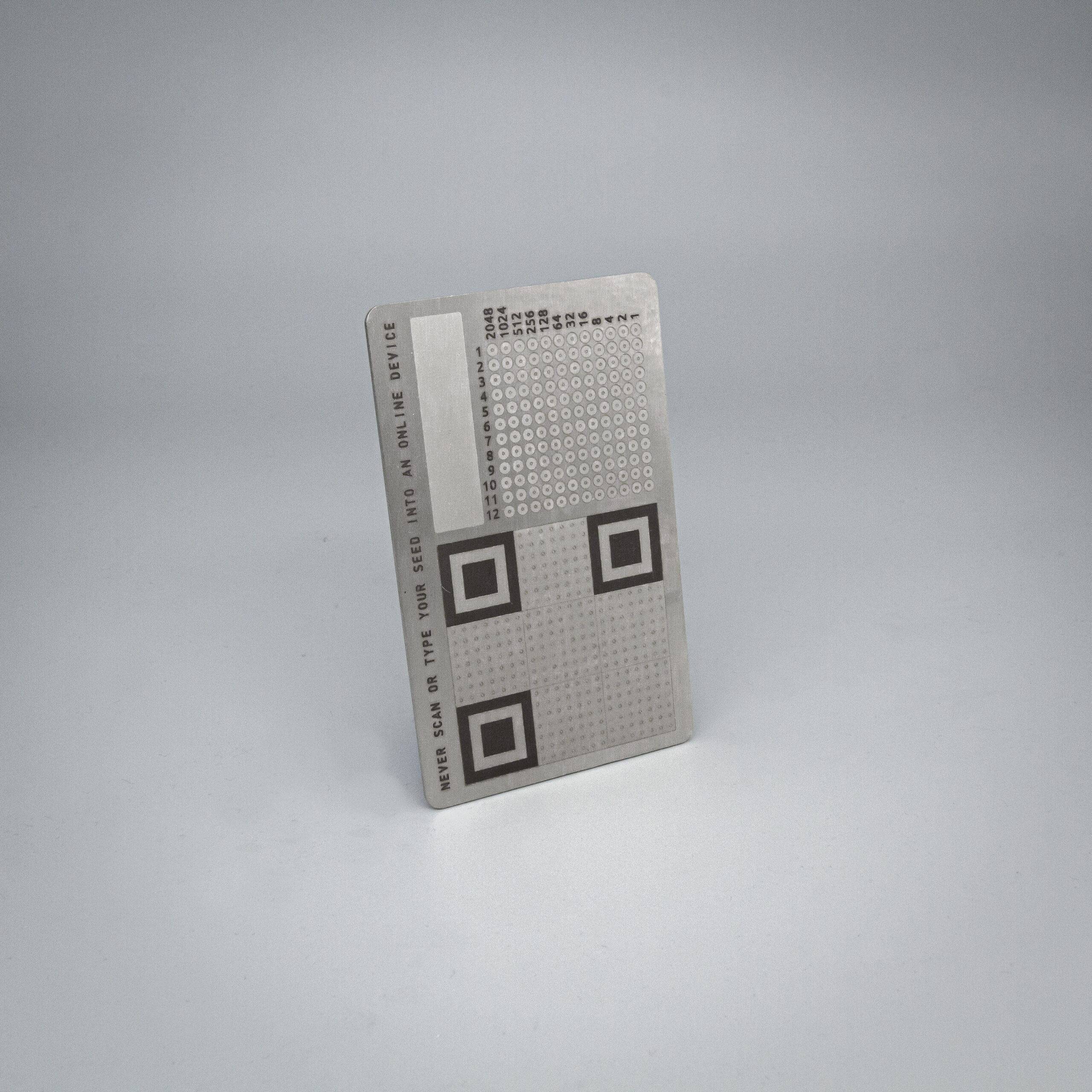 The Onboarding Card is a 1mm strong credit card sized seed backup plate made of 316L stainless steel that you can carry in your wallet. The Onboarding Card offers three different methods of storing your 12 word seed on steel. A C12 SteelQR, a binary encoding of the bip39 seed word index numbers as well as twelve rows to stamp each of your backup words in human readable form. It is the ideal item for quick Bitcoin shills, precise elevator pitches and effective physical onboarding.